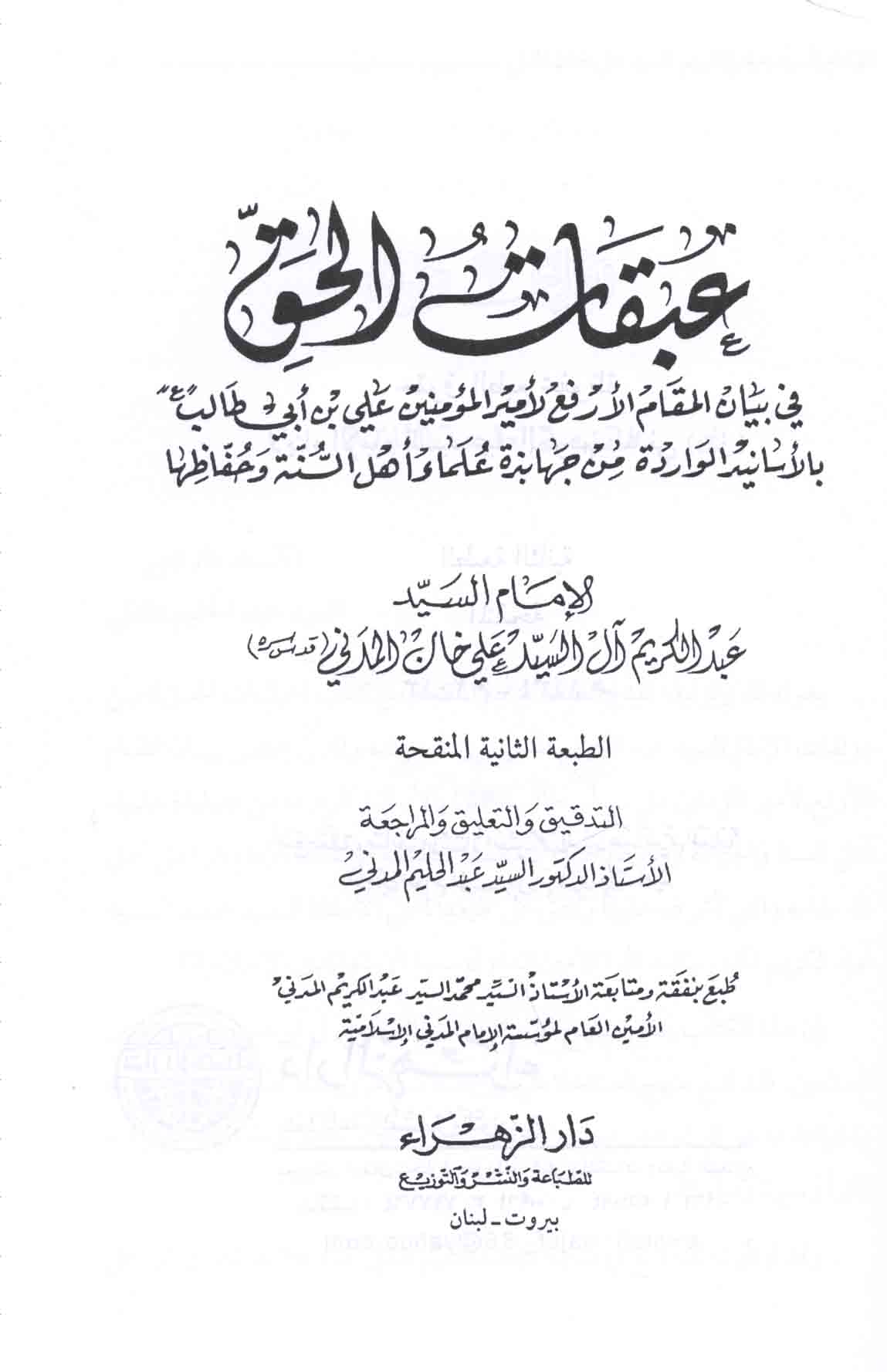 Abaqāt al-ḥaqq, fī bayān al-maqām al-arfa‘ li-Amīr al-mu’minīn ‘Alī ibn Abī Ṭālib bi-al-asānīd al-wāridah min jahābidhat ‘ulamā’ ahl al-Sunnah wa-ḥuffāẓihā