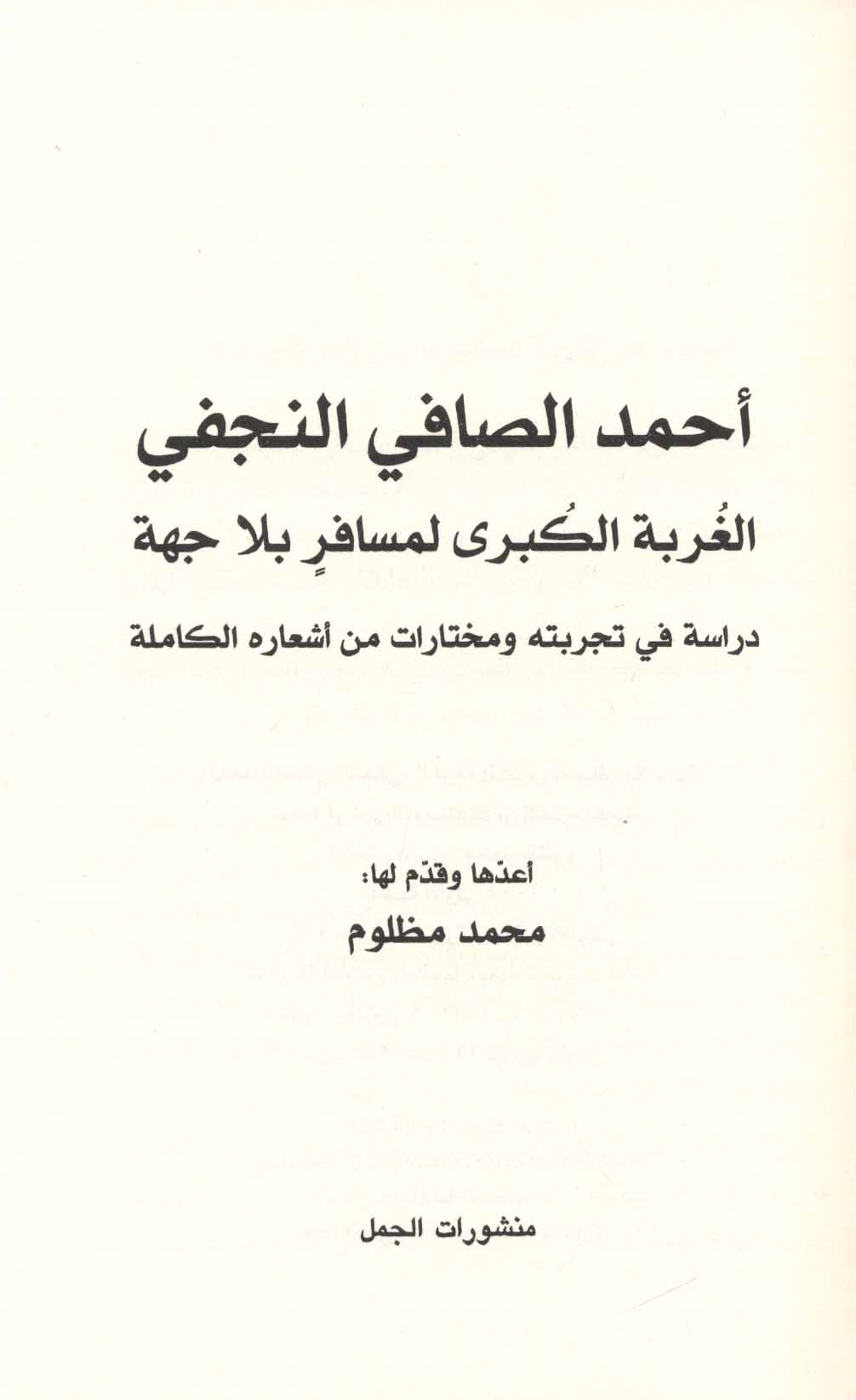 Aḥmad al-Ṣāfī al-Najafī al-ghurbah al-kubrá li-musāfir bi-lā jihah, dirāsah fī tajribatihi wa-mukhtārāt min ash‘ārihi al-kāmilah