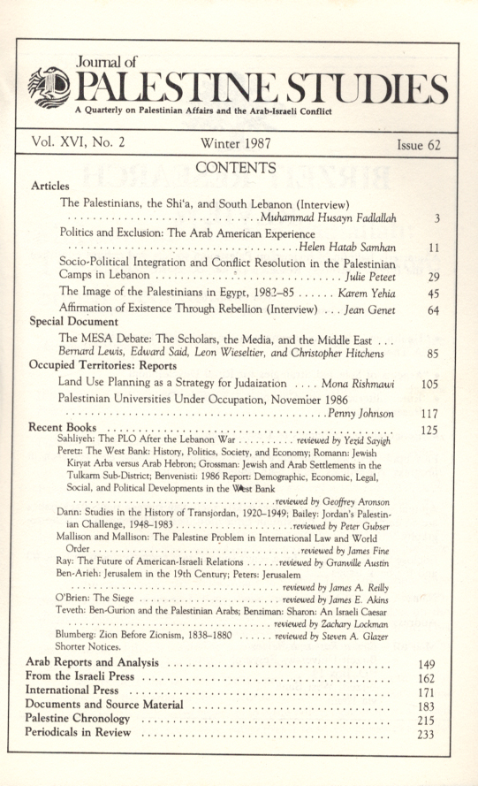 Journal of Palestine Studies, A Quarterly on Palestinian Affairs and the Arab-Israeli Conflict (Vol. XVI, No. 2)