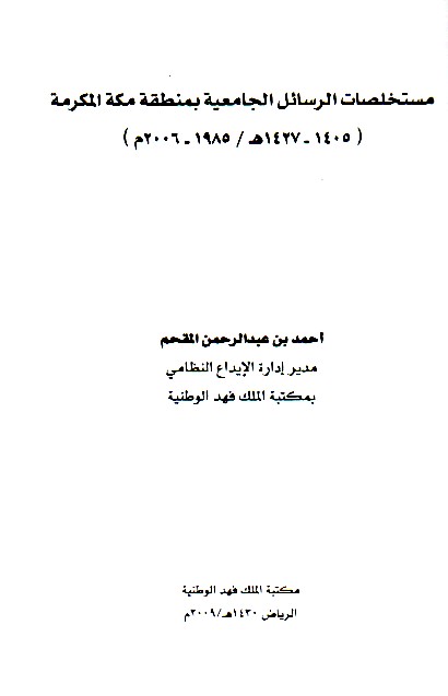 | Mustakhlaṣāt rasā’il al-mājistīr wa-al-duktūrāh bi-Kullīyat al-Ādāb wa-al-‘Ulūm al-Insānīyah Jāmi‘at al-Malik ‘Abd al-‘Azīz, 1400-1428 H./ 1980-2007 M. |