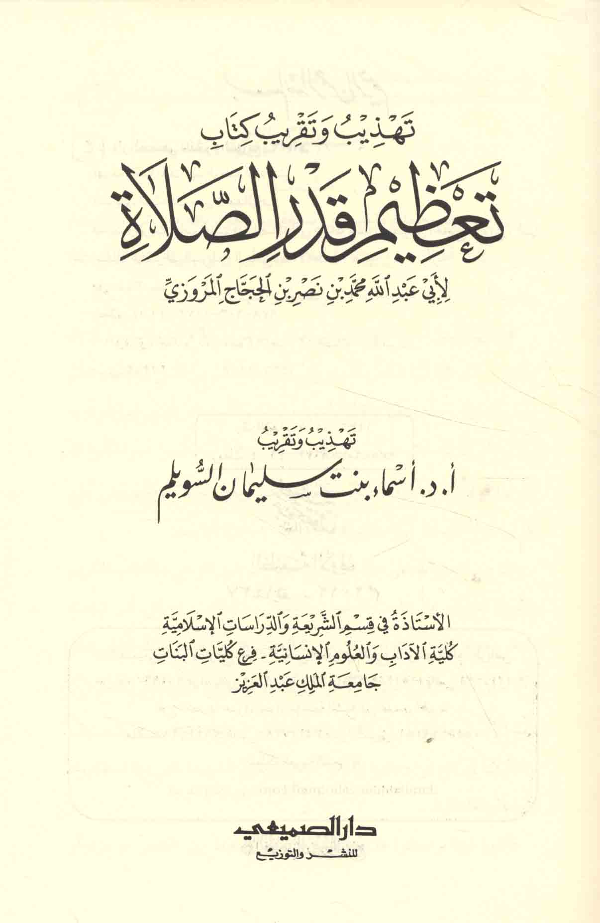 Subject: Marwazi, Muhammad ibn Nasr, 817 or 818-906. Tazim qadr al-salah.